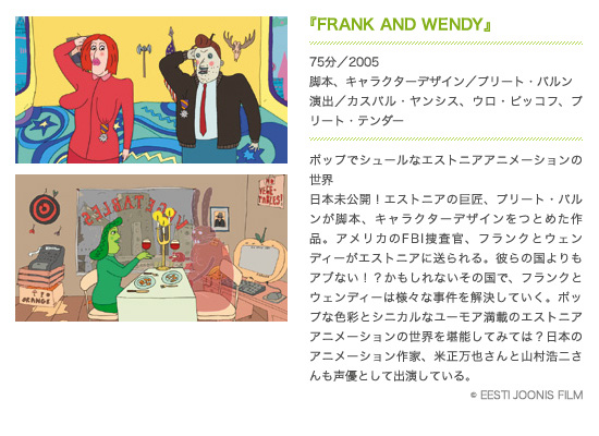 シニカルでポップ、不条理ユーモア満載のエストニア、明るく陽気なキューバ、素朴だが深みのあるロシア…と個性豊かな世界のアニメーションの注目作品を取り揃えました。
