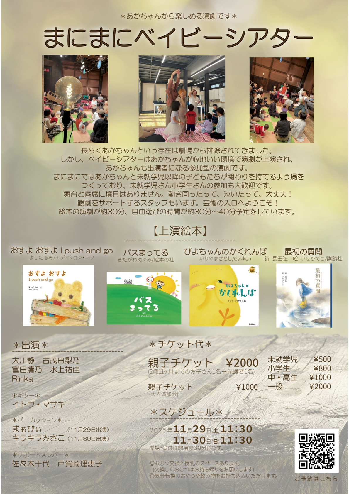 *まにまにベイビーシアター* *あかちゃんから楽しめる演劇です* 長らくあかちゃんという存在は劇場から排除されてきました。 しかし、ベイビーシアターはあかちゃんが心地いい環境で演劇が上演され、あかちゃんも出演者になる参加型の演劇です。 まにまにではあかちゃんと未就学児以降の子どもたちが関わりを持てるよう場をつくっており、未就学児さん小学生さんの参加も大歓迎です。 舞台と客席に境目はありません。動き回ったって、泣いたって、大丈夫! 観劇をサポートするスタッフもいます。芸術の入口へようこそ! 絵本の演劇が約30分、自由遊びの時間が約30分〜40分予定をしています。 【上演絵本】 『おすよ おすよ I push and go』よしだるみ/エディション・エフ 『バスまってる』きたがわめぐみ/絵本の杜 『ぴよちゃんのかくれんぼ』いりやまさとし/Gakken 『最初の質問』詩 長田弘 絵 いせひでこ/講談社
