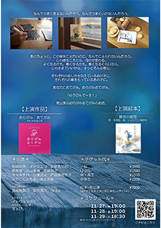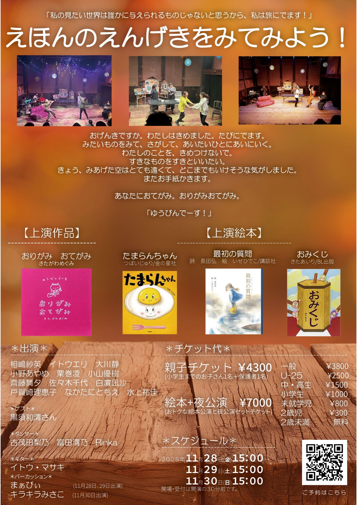 【日時(タイムテーブル)】 2025年 11/27(木) 19:00夜公演 11/28(金) 15:00絵本の演劇/19:00夜公演 11/29(土) 11:30ベイビーシアター/15:00絵本の演劇/18:30夜公演 11/30(日) 11:30ベイビーシアター/15:00絵本の演劇 【チケット】 *ベイビーシアター* 親子チケット 2,000円 (2歳までのお子さん1名+保護者1名) 親子チケット大人追加1名1,000円 未就学児500円 小学生 800円 中・高生1,000円 一般 2,000円
