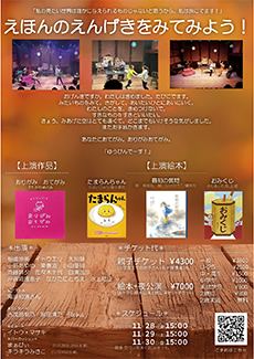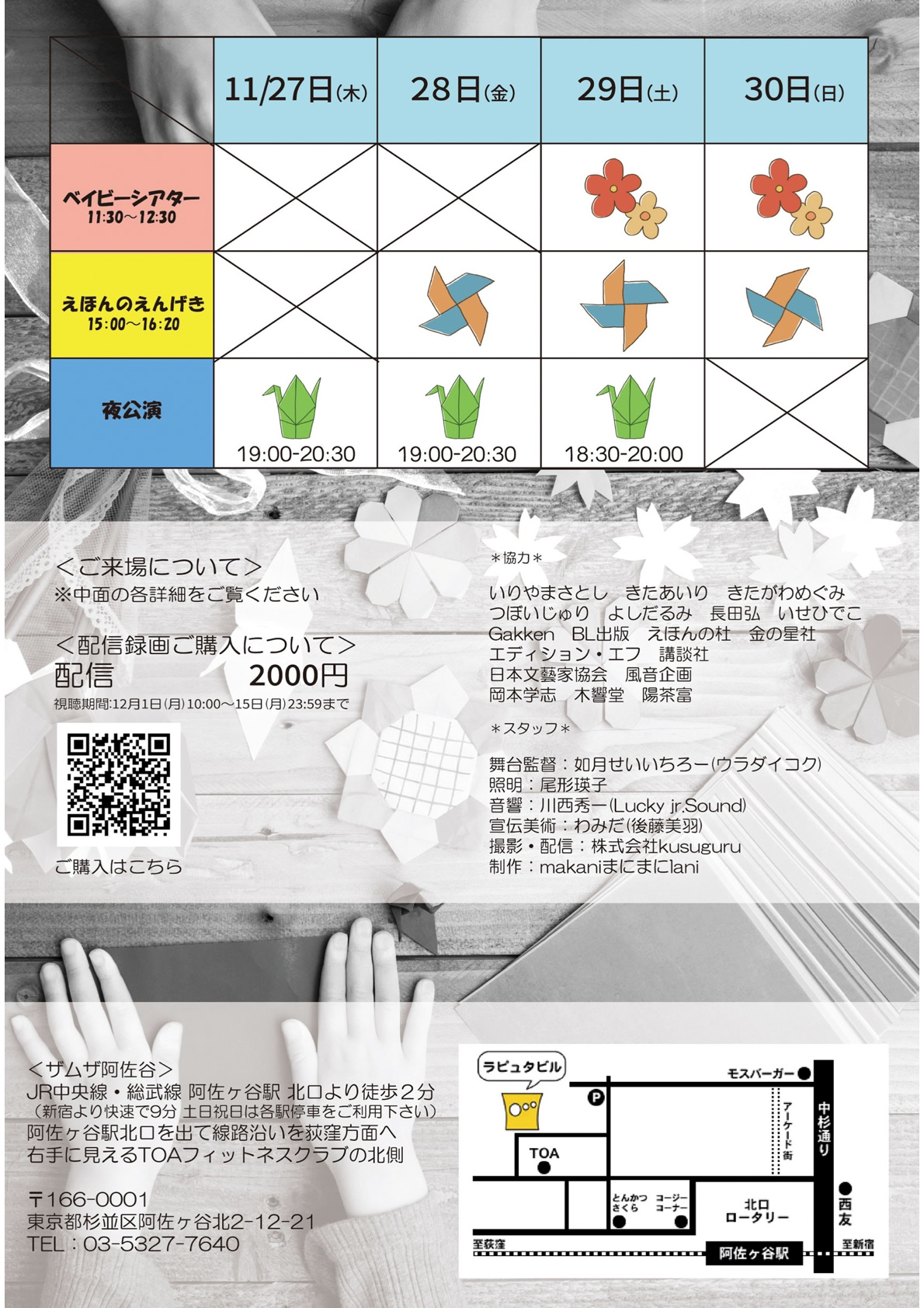 コメント: あかちゃんから大人まで楽しめる公演です! 午前はあかちゃんが安心できる環境で上演する ベイビーシアター。舞台上が客席となり、舞台と客席に境目はありません。 午後は絵本を原作とした演劇、夜は絵本作家・ きたがわめぐみさんのYouTube作品 「おりがみ おてがみ」を演劇化して上演します。