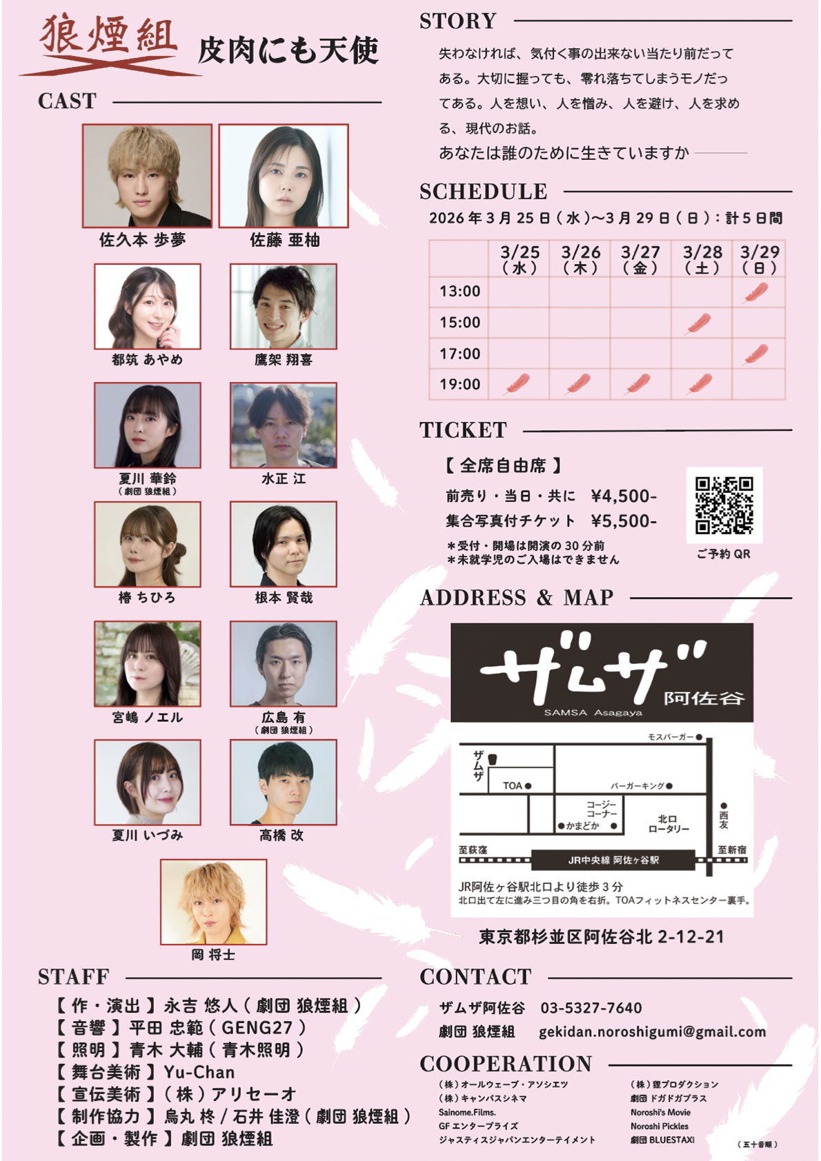 【 脚本 】永吉 悠人( 劇団 狼煙組 ) 【 演出 】永吉 悠人( 劇団 狼煙組 ) 【 出演 】佐久本 歩夢 / 佐藤 亜柚 / 都筑 あやめ / 鷹架 翔喜 / 夏川 華鈴( 劇団 狼煙組 ) / 水正 江 / 椿 ちひろ / 根本 賢哉 / 宮嶋 ノエル / 広島有( 劇団 狼煙組 ) / 夏川 いづみ / 高橋 改 / 岡 将士 【 音響 】平田 忠範( GENG27 ) 【 照明 】青木 大輔( 青木照明 ) 【 舞台美術 】Yu-Chan 【 宣伝美術 】(株)アリセーオ 【 制作協力 】烏丸 柊 / 石井 佳澄( 劇団 狼煙組 ) 【 企画・製作 】劇団 狼煙組