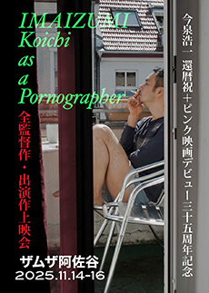 コメント: 今泉浩一:1965年東京生まれ。1985年より東京グランギニョルへの参加を経て、1990年、佐藤寿保監督のピンク映画『制服盗撮魔 激射・なぶる!』で映画デビュー。以降ピンク映画を中心に俳優活動を続ける。1999年に初の監督作となる『憚り天使』を発表、俳優業と並行して「ゲイ」をテーマにした自主映画を撮り続ける。監督作品はベルリン国際映画祭、バンクーバー国際映画祭、台北金馬映画祭、香港国際映画祭など多くの海外の映画祭で上映される。還暦を迎え、映画デビュー35周年となる2025年、全監督作品と、いまではなかなか観る機会のない出演作OV2本を上映、加えて2019年から撮り始め未だ完成していない新作『東京漂流』のティーザー版を初披露。ヘテロ・ポルノ男優を職業とし、自主制作でゲイ・ポルノ映画を撮る世界でも稀有な存在のポルノ人生を振り返る上映会。